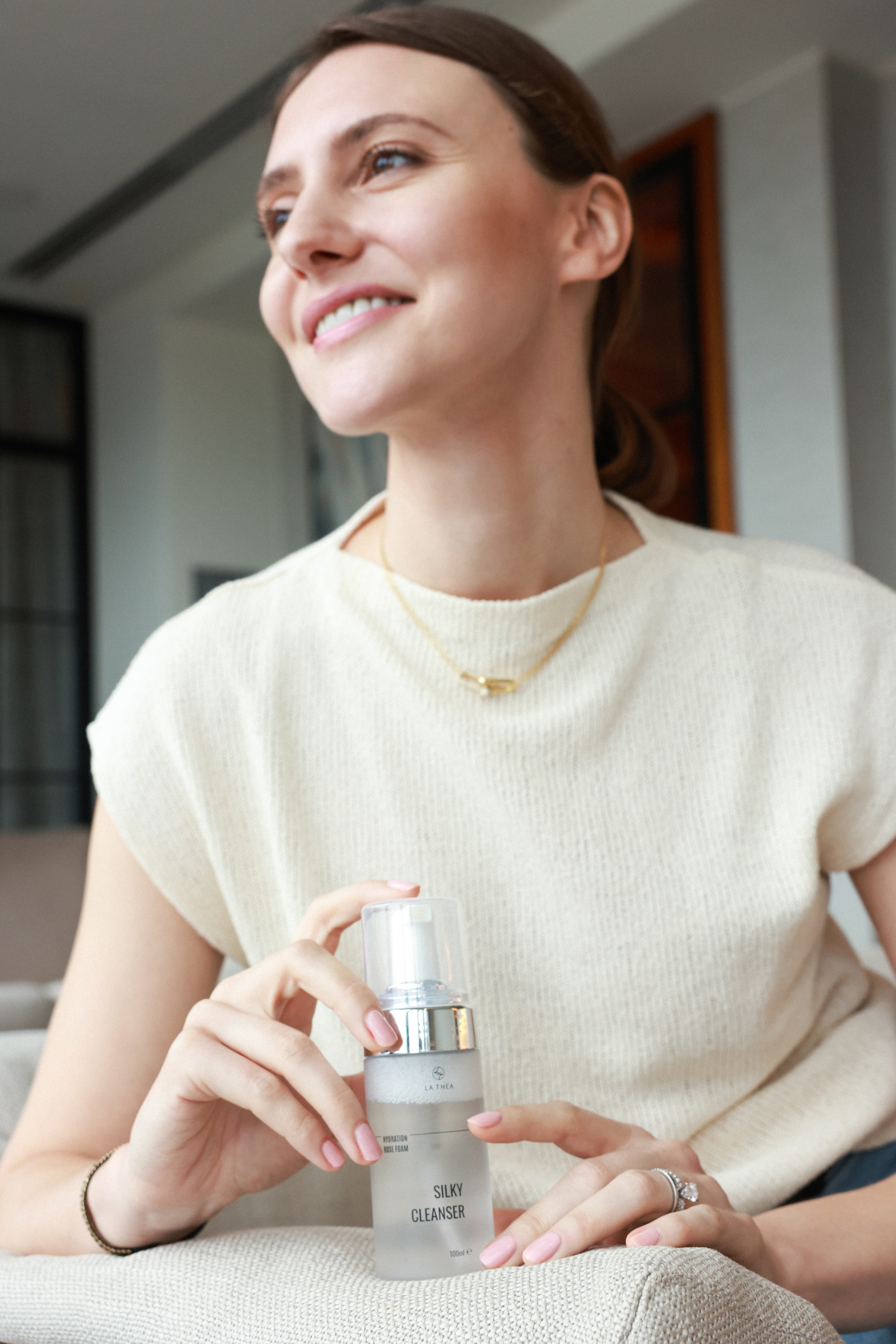 "As a mother, Actress and TV presenter, I don't have much time to devote to my daily skincare. That's why discovering La Thea has been made my skincare routine so convenient. I use it morning and evening by spraying the rose water and applying the serum afterwards. I also love using the serum before applying my makeup as it makes my skin smoother and gives it a glowing appearance. And here's a little secret: I always spray La Thea rose water before going on stage. It gives me a fresh and energized feeling."